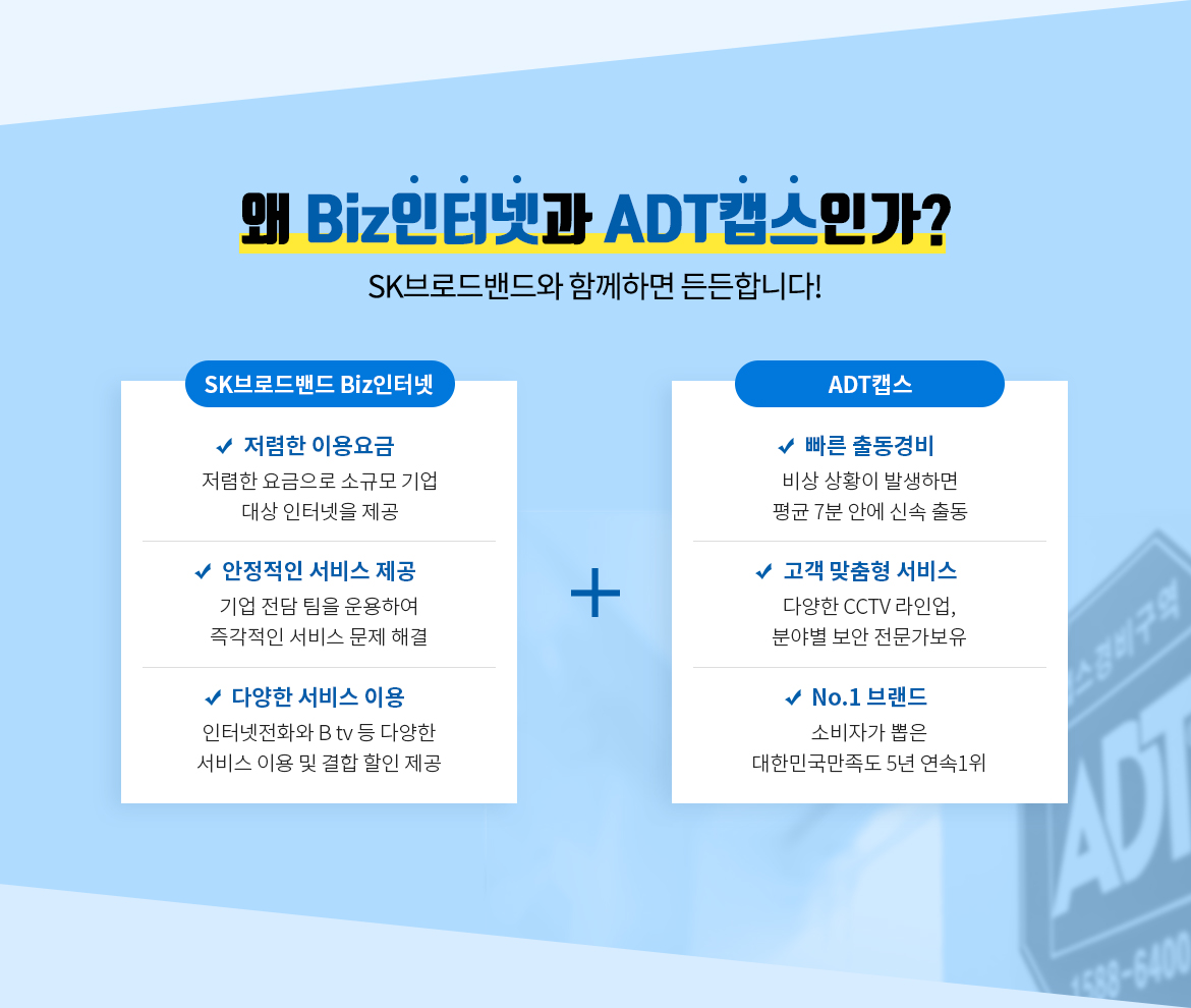 ADT캡스 보안서비스와 SKB 기업통신서비스를 결합해 요금할인받아보세요.