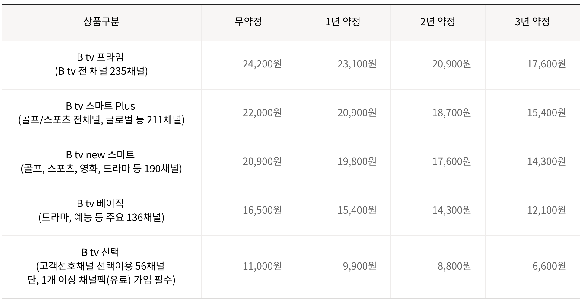 B tv 기본상품, 선호채널 선택 필수상품