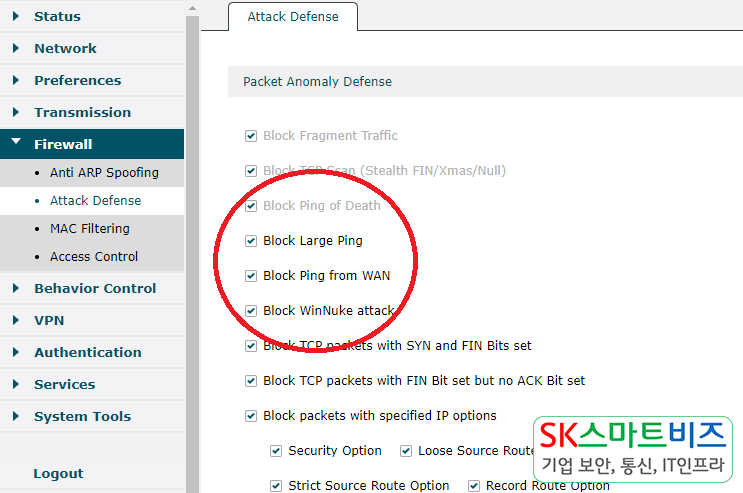 1) death of ping 공격은 대용량의 ping 패킷을 랜덤 한 주소에서 발신하여 수신자의 트래픽을 과부하 시키는 DOS 공격의 일종으로 VPN 관리자 페이지 내 외부에서의 ping을 차단해 주시면 개선이 가능합니다.