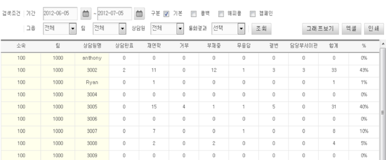 - 상담원별, 팀별, 그룹별, 큐에 대한 다양한 통계 기능