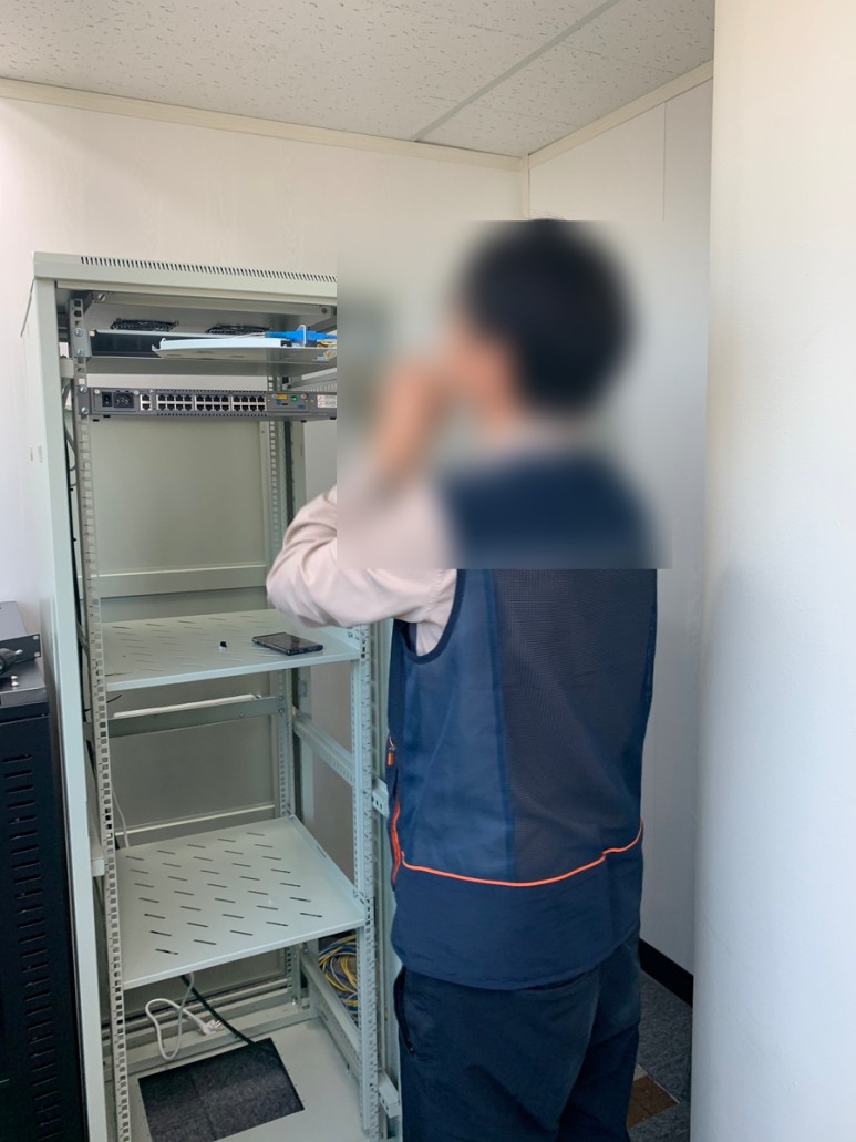 방화벽 장비를 허브렉에 시설하고, 서버 보안설정을 하기 위해 보안 관제센터와 협의 처리하는 모습입니다.