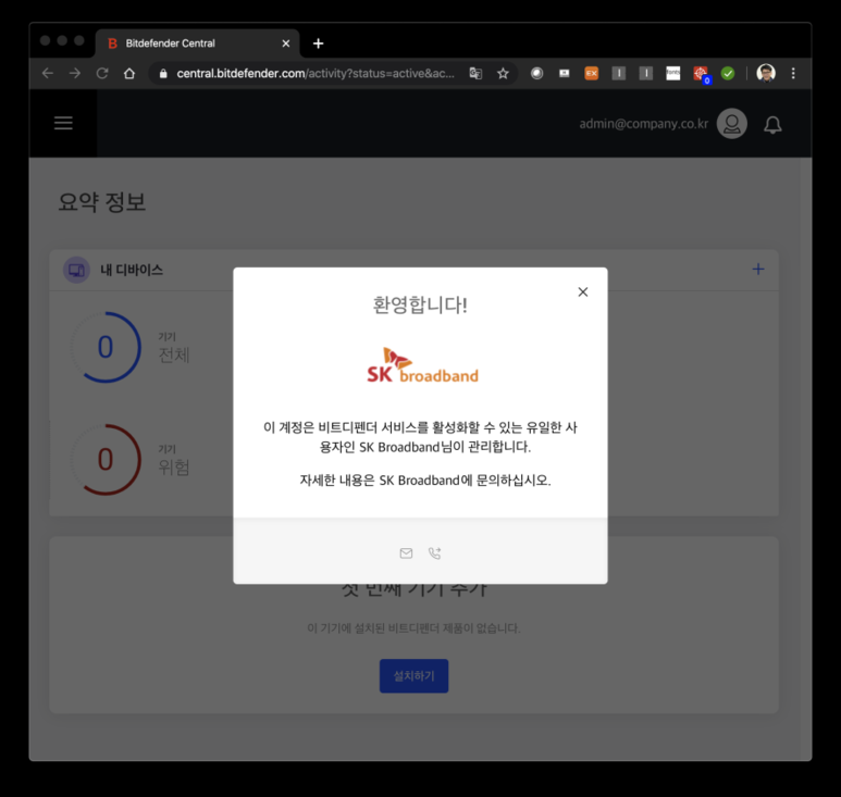 ② 환영 화면의 [x]를 클릭하여 Bitdefender CENTRAL 메인 화면으로 이동