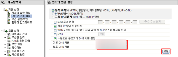 3. 변경하실 [기본 DNS 서버] 와 [보조 DNS 서버]를 입력 후 [적용] 버튼을 클릭합니다.