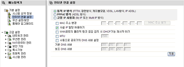 공유기 설정화면에 접속하신 후 [관리도구] -> [기본설정] -> [인터넷연결설정] 메뉴로 접속합니다.