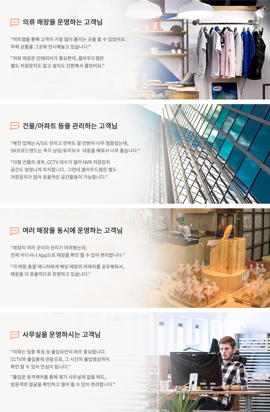 사업장에 별도 저장장치(NVR/DVR)없이 SK 클라우드 서버에 안전하게 저장하는최첨단 영상보안시스템(CCTV)과 출입통제시스템(부가서비스)