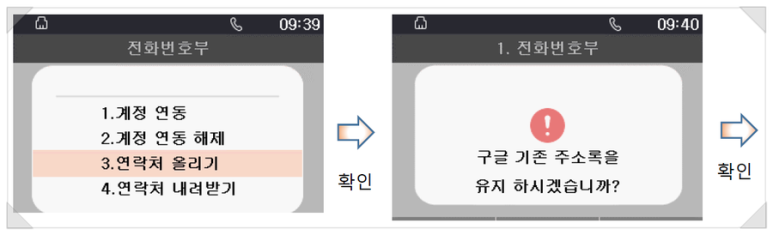 첫 번째 단계인 계정 연동 이후, 1 시간이 지나면 연락처 올리기나 내려받기 실행 시 아래 왼쪽과 같은 화면이 표시될 수 있습니다. 이경우 연동 정보 갱신을 위해 1. 계정 연동을 다시 한번 선택합니다.