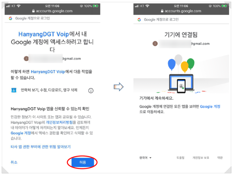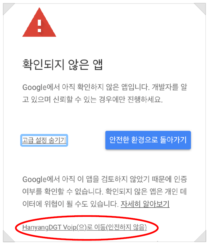 주소록 연동 앱 HanyangDGT Voip 은 현재 등록 대기 중입니다. 구글 본사 입장에서 아직 확인되지 않은 앱 ’으로 분류되어 있으므로, 위와 같이 한 단계 더 확인 과정이 필요합니다. ‘안전하지 않음이라는 문구가 표시되더라도, 전혀 걱정하실 필요가 없습니다. 해당 앱이 차후 등록 완료되면, 위와 같은 과정이 필요 없어질 수 있습니다. |