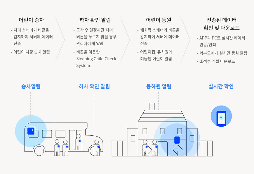 버스 실시간 위치확인, 승하차 확인 및 알림, 등하원 확인 및 알림