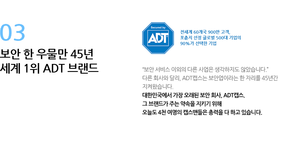 기업서비스/물리보안 (ADT캡스) ADT캡스 출동경비 BizAdmin 2019. 4. 22. 23:00 문의접수 부탁드립니다. 스피드 출동 서비스 24시간 이내 당일처리 글로벌 보안전문기업 공유하기 게시글 관리 [기업통신 보안 SmartBiz] 영업 blog 저작자표시 비영리 변경금지 (새창열림) '기업서비스/물리보안 (ADT캡스)' Related Articles ADT캡스 공장/창고 설치사례 물리보안 (CCTV, 출동경비) ADT캡스 CCTV ADT캡스 출입통제