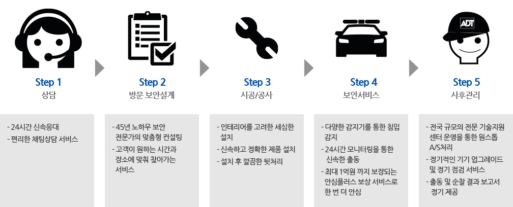 ADT캡스 보안전문가가 고객 사업장에 맞춘 컨설팅에서 보안설계, 제품 설치, A/S, 비상시 출동까지 체계적으로 관리하고 꼼꼼하게 서비스합니다.